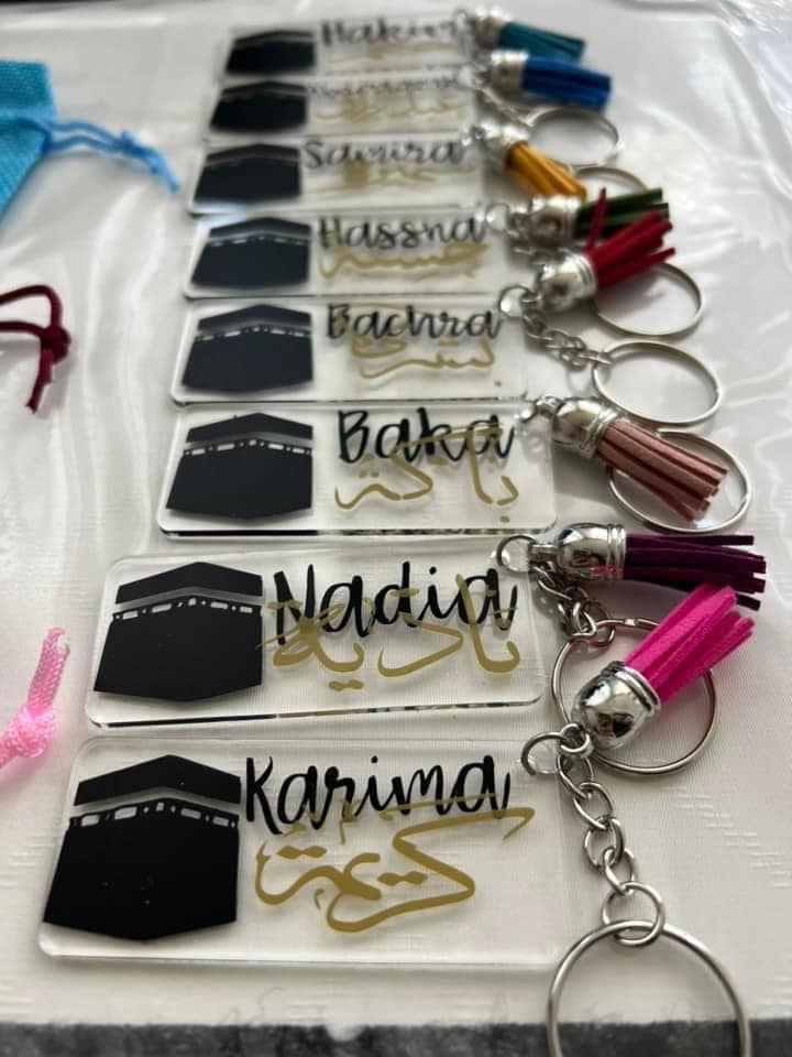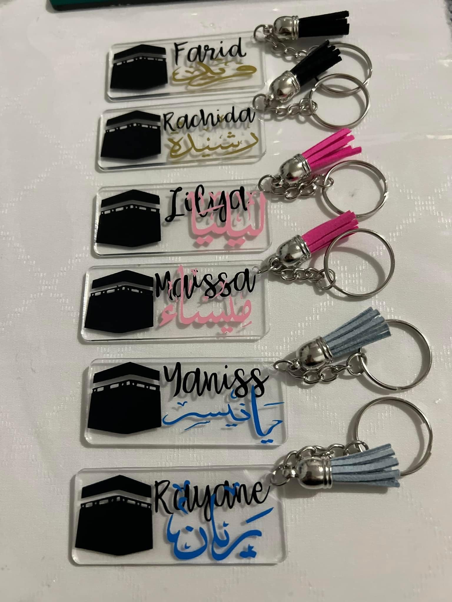 Porte clés personnaliser en deux langues française et arabe couleur noir et doré motif la mecca